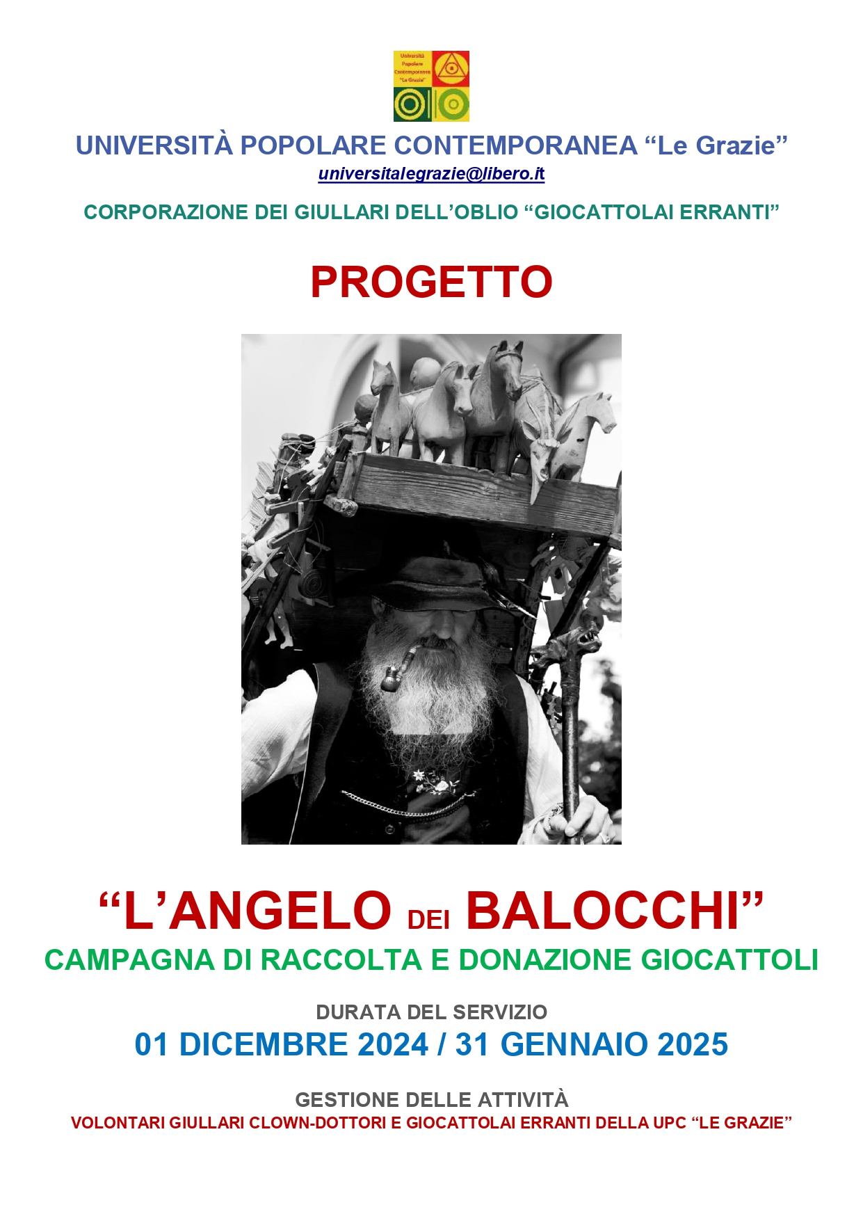 Il gruppo dei “GIOCATTOLAI ERRANTI” della UPC “Le Grazie” ogni anno porta a termine la sua missione attraverso l’attuazione del macro-progetto-pluriennale da noi denominato “L’ANGELO DEI BALOCCHI”.